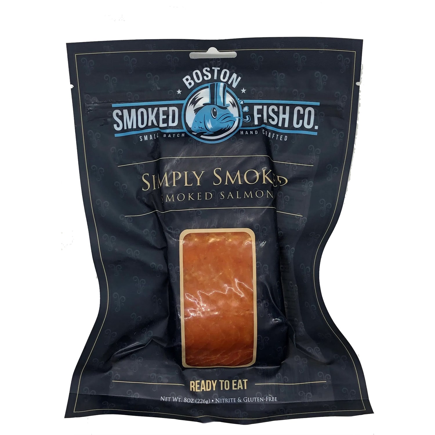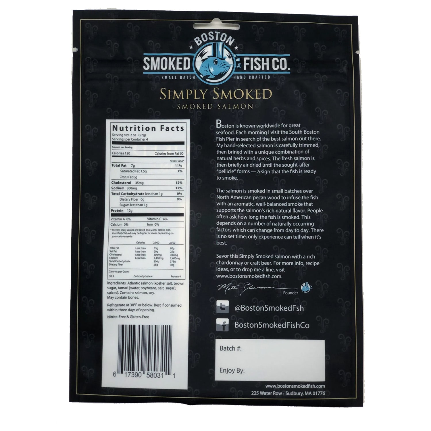 We brine our carefully curated fresh Atlantic salmon in a saltwater bath packed with fresh herbs and spices then smoke-roast it in small batches over North American pecan wood. The end result is an aromatic, well-balanced smokiness that supports the salmon’s rich natural flavor.